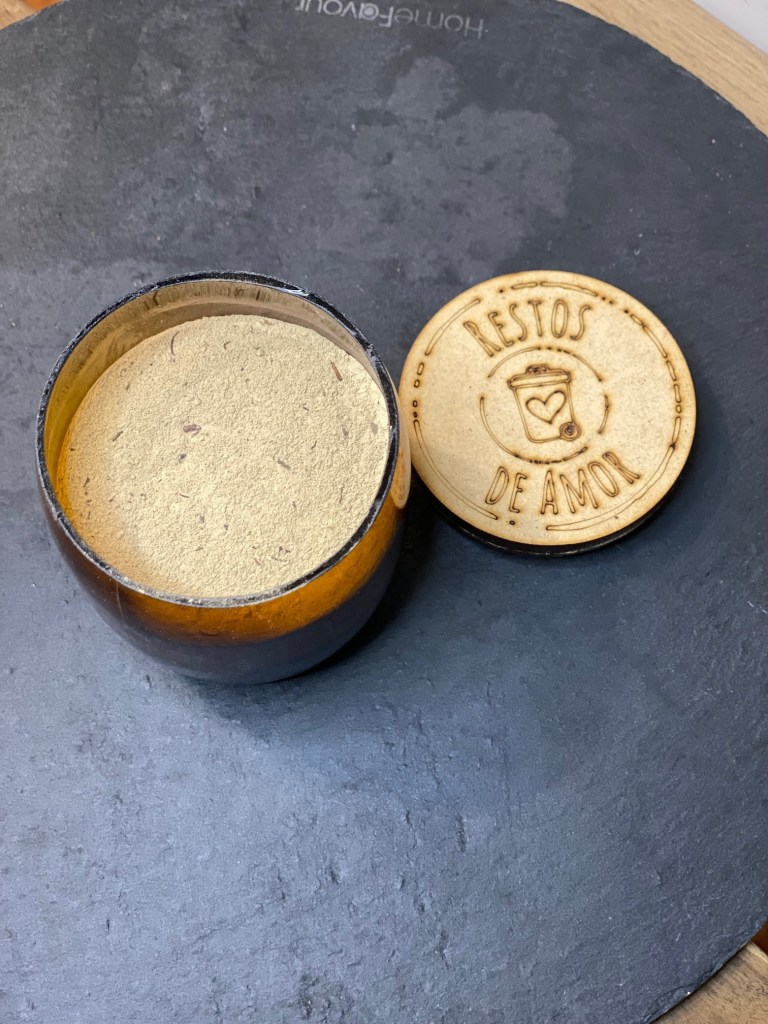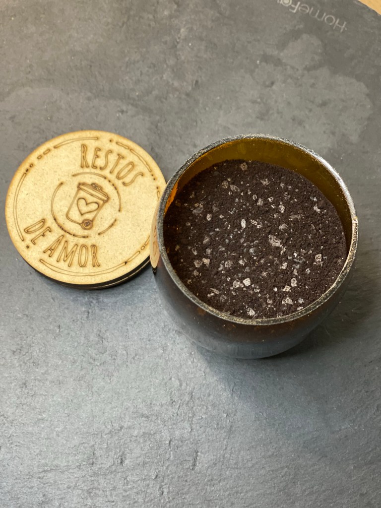 Extracto de café, sal de mar, aceite de almendra, aceite de olivo y aceite esencial de sándalo.