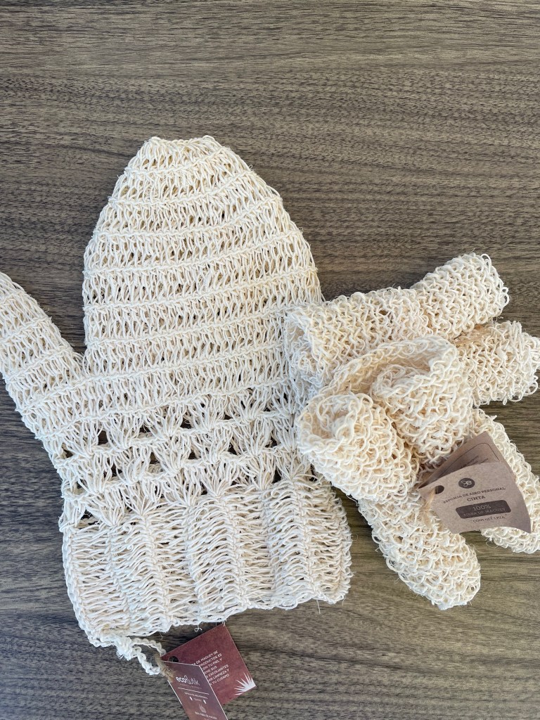 Distintos estropajos artesanales en formas de guante, toalla y corazón.