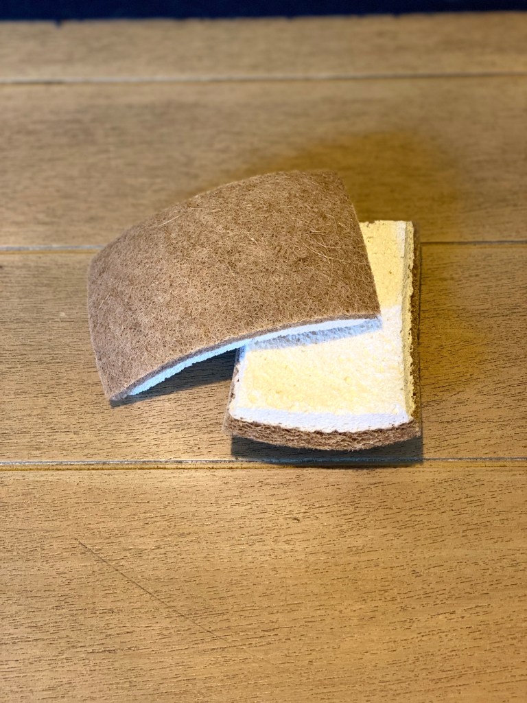 Fibra lavatrastes, hecha de materiales reciclados como fibras de agave para tallar y del otro lado una esponja para cristalería.