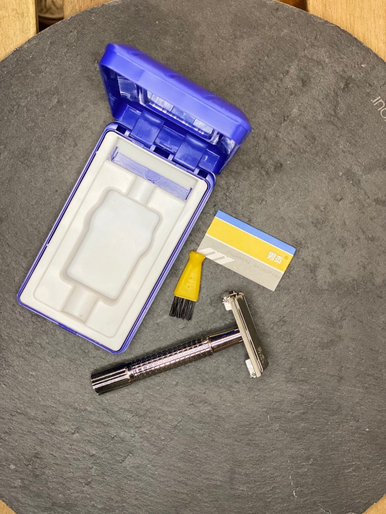 Rastillo tipo vintage, con navaja y cepillo para limpiarlo.